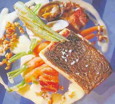 Plat à base de dos de bars, garni de coquillages, et d'une sauce courte au noilly prat