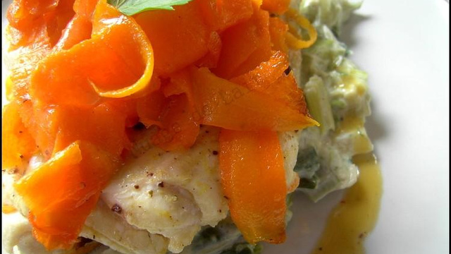 Dans vos assiettes de service, chaudes de préférence, disposer un lit de poireaux à la crème sur lequel vous déposerez un morceau de poisson surmonté d'un petit nid de tagliatelles de carottes. Verser un peu de sauce sur le dessus et un filet tout autour de l'assiette. Servir immédiatement.