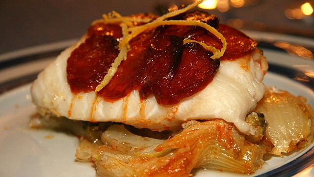 Huiler légèrement un plat allant au four. Placer les fenouils braisés dans le fond du plat. Disposer les dos de cabillaud sur les fenouils et les recouvrir chacun de 8 tranches de chorizo en les faisant se chevaucher comme des écailles. Enfourner 15 min.