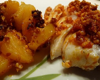 Mettre dans un plat à gratin, recouvrir du crumble chorizo/parmesan et mettre au four préchauffé à 180°C ou Th.6 pour environ 6 à 7 mn le temps que le poisson soit cuit à point, tout en restant moelleux.