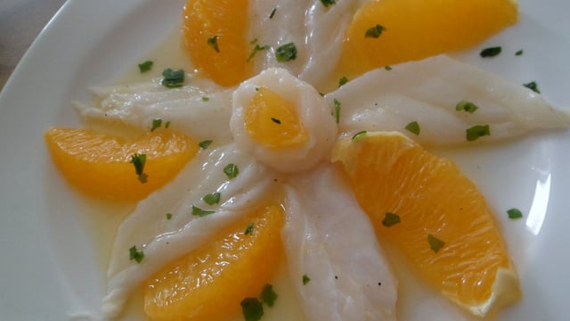 Dresser vos assiettes en alternant suprêmes d'orange et tranches de dos cabillaud marinées.