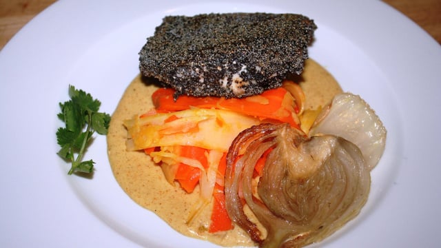 Ferme (poisson) croustillant (pavot pané), diététique (légumes vapeur), émoustillant (sauce au curry) un joli plat de poisson pour se faire plaisir entre amis.