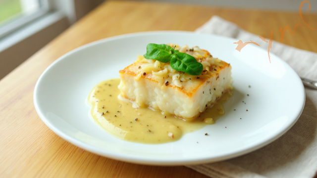 Après réduction de la sauce, dressez le cabillaud avec la sauce.
