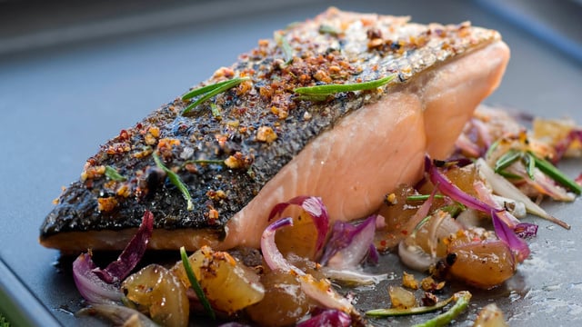 Dresser sur assiette un dos de saumon par personne, entouré d'oignons et châtaignes dorées.