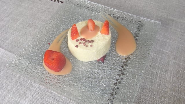 C'est un bavarois vanille sur croquant de framboises séchées, avec une crème anglaise à la fraise.