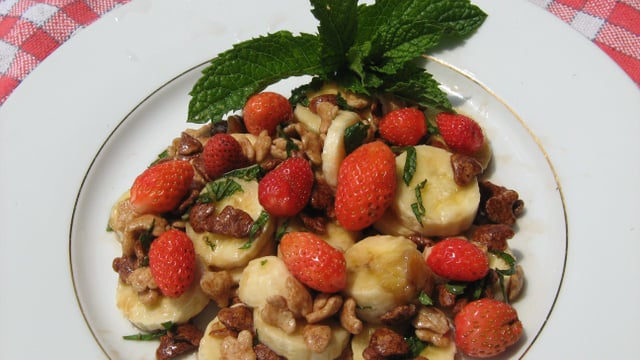 Coupez la banane en rondelles, les citronner, ajoutez le sirop, mélangez, ajoutez la menthe ciselée et mettre au frigo pendant 1 heure.