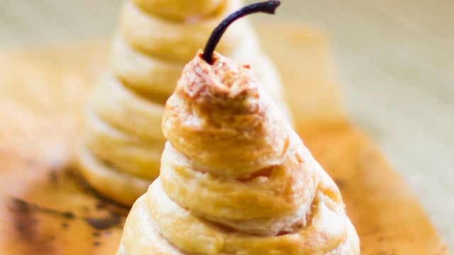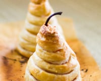 Disposer chaque poire queue vers le haut sur un triangle de pâte. Humecter les bords, les relever et les presser avec les doigts pour les souder. Si vous souhaitez une présentation plus élaborée, faites un long boudin de pâte et enroulez-le autour de la poire en humidifiant la pâte pour qu'elle se tienne mieux.