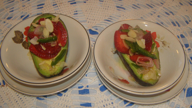 Couper l'avocat en deux. Enlever le noyau. Arroser les demi-avocats d'un petit jus de citron et les disposer sur les assiettes. Les garnir de fraises et d'amandes puis les arroser de vinaigrette au piment. Servir bien frais.