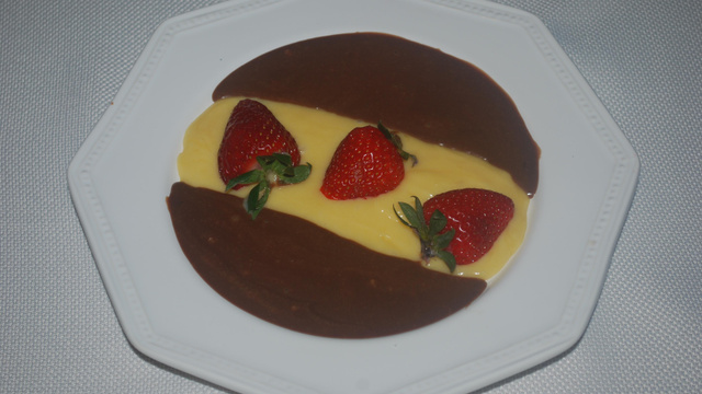 Ensuite verser doucement au centre le chocolat blanc puis le chocolat au lait ou noir. Décorer avec 2,3 fraises. Remettre au frais avant de déguster.