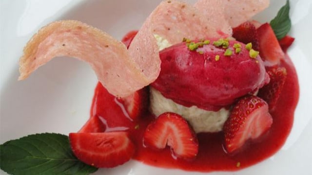 Recette gourmande avec le mariage de la fraise et de l'hibiscus en sorbet, le blesotto vanille crémeux et la douceur de la fraise.