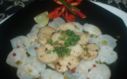 Couper en lamelles fines quatre Saint-Jacques par personne pour le carpaccio.