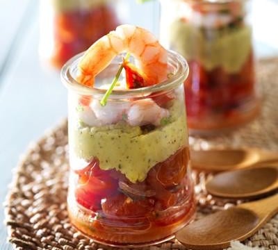 Laver et couper les tomates cerise en 4. Couper les tomates cerise séchées en 2. Eplucher et ciseler l'échalote. Mélanger les tomates, l'échalote avec un peu d'huile de tomate séchée et le jus du citron. Répartir les tomates dans le fond des verrines, ajouter la Tapena' de pois chiches verts à la menthe. Mélanger les crevettes coupées en petite cube avec la ciboulette ciselé. Terminer la verrine avec les crevettes.