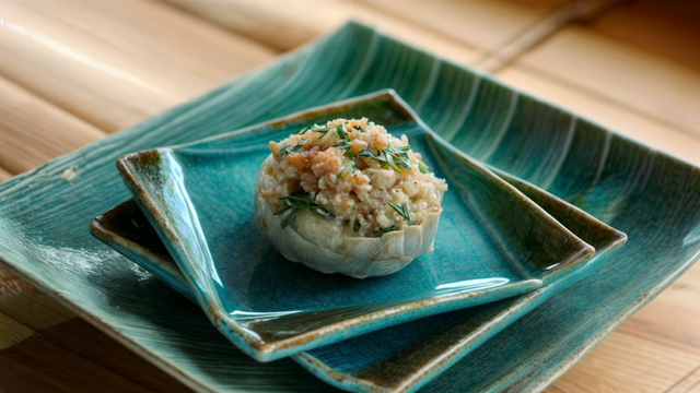 Le duo surimi- artichaut reste très moelleux. Les notes acidulées de citron créent une liaison parfaite entre la farce coriandre- surimi et le goût particulier de l'artichaut.