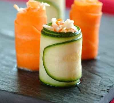 Composer de petites boules de 2 cm de diamètre avec le mélange, les poser à une extrémité d'une lamelle de légume et puis les rouler.