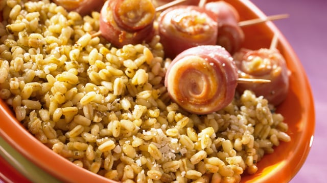 Dans les assiettes de service, déposez les roulade de poulet, ajoutez l'Ebly® au pesto, servez aussitôt.