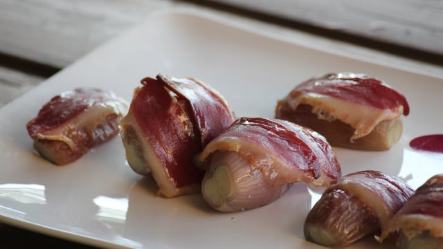 Sortir la peau, les couper en deux, les assaisonner et entourer chaque échalote d'une tranche de magret. Déguster.