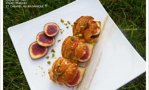 Trois petits choux collés comme un éclair, garnie d'une crème pâtissière au miel et à la figue et garni de figue fraîche !