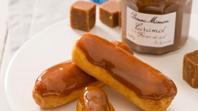 Placer le Caramel Bonne Maman® dans une poche à douille Percer l’éclair au-dessous, et à l’aide de la poche à douille, le remplir de Caramel Bonne Maman®.