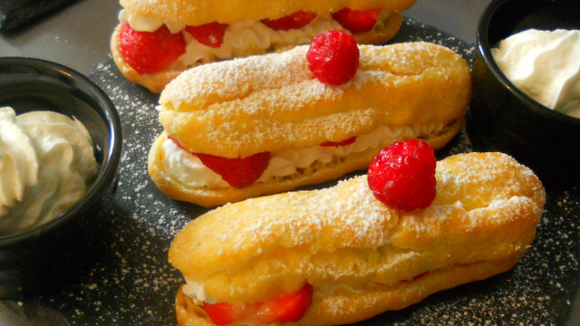 Couper les éclairs en deux, les garnir de crème puis de fraises lavées et équeutées et de nouveau de crème. Saupoudrer de sucre glace et c'est prêt !
