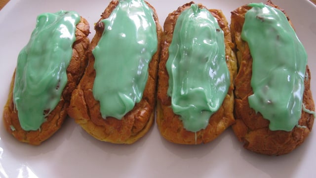 A l'aide d'une poche à douille, fourrez les choux refroidis. Faites fondre le fondant 10 sec au micro-ondes, il faut juste le ramollir mais pas le cuire. Ajoutez une goutte de colorant bleu et une goutte de colorant jaune, mélangez et recouvrez les éclairs de fondant.