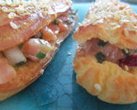 On mélange tous les ingrédients du tartare (les deux saumons en dés, la pomme en brunoise, l'oignon émincé, la ciboulette ciselée et l'huile d'olive) et on assaisonne frenchement. Le jus de citron ne sera ajouté que cinq minutes avant le garnissage des éclairs.