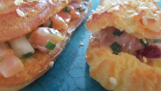 Un éclair salé garni d'un tartare de saumon à la pomme verte.