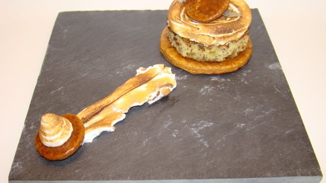 La pâte feuilletéeLaissez votre four à 180°C. Etalez votre pâte feuilletée sur votre plan de travail fariné sur une hauteur de 3mm. A l'aide du même cercle à tartelette, découpez 4 disques de pâte, ainsi que 8 autres beaucoup plus petits, posez-les sur une plaque recouverte d'une feuille de papier sulfurisé. Saupoudrez de sucre glace, et faites cuire au four environ 5mn jusqu'à ce que le feuilletage se développe et gonfle. Recouvrez ensuite d'une feuille de papier sulfurisé, puis posez une autre plaque afin que le feuilletage ne gonfle plus. A mi-cuisson, retournez les disques de pâte et saupoudrez de sucre glace également.La meringueMontez les blancs en neige, et lorsqu'ils deviennent mousseux, ajoutez progressivement le sucre semoule. Mélangez jusqu'à l'obtention d'une meringue ferme et brillante. Remplissez une poche munie d'une douille unie.DressageSur chaque fond de pâte feuilleté et caramélisé, posez un rond de crème amande citron et pavot. Dressez dessus à la poche la meringue et brûlez au chalumeau. Décorez avec une écorce de citron confit roulée dans les graines de pavot, puis un petit disque de pâte feuilletée et caramélisée. Posez chaque galette sur une ardoise, et mettez à l'autre bout dans la diagonale un petit disque feuilleté recouvert de meringue brûlée. Faites aussi un grand trait de meringue brûlée entre les deux.....il ne reste plus qu'à déguster !