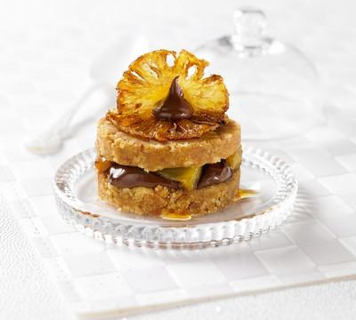 Une fois les préparations refroidies et durcies, disposer une nouvelle couche de palets bretons sur chaque montage. Ajouter les morceaux d'ananas caramélisés sur le dessus. Réserver au frais jusqu'au moment de servir.