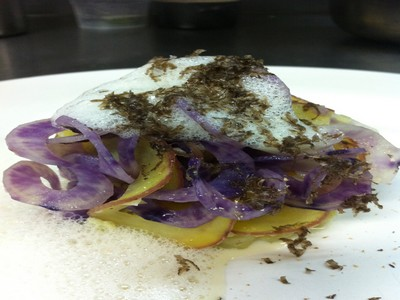 - 4DressageRéchauffer les rattes 30 secondes, ajouter la réduction de jus de Truffe. Écraser les pommes de terre et les parures de Truffe, les cercler dans des cercles. Passer les Vitelottes, les Rosevalt et les Mona Lisa au coupe légumes spirale.