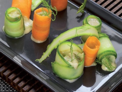 Rouler les lamelles de légumes avec le mélange de brie (comme des sushis). Sur une lamelle de légume, mettre le brie au centre et rouler.