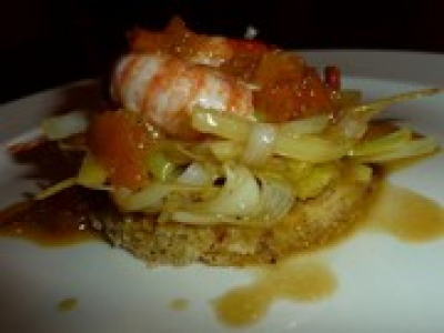 Ecrevisses justes poêlées servies sur une fondue de poireaux et un biscuit au pain, le tout arrosé d'une sauce aux carcasses, kumquats et jus de mandarine.