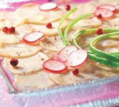 Disposer les tranches en rosace dans chaque assiette au fur et à mesure du tranchage.