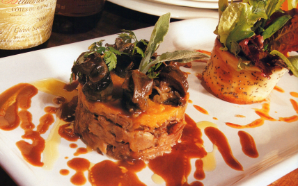 Renverser l'effilochée de canard. Ajouter dans l'ordre une fine couche d'embeurrée de potiron, les escargots.