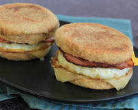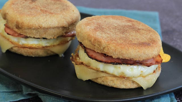 Posez chaque base de muffin sur une assiette, ajoutez une tranche de fromage, un oeuf, une tranche de bacon et recouvrez avec la partie supérieur du muffin.
