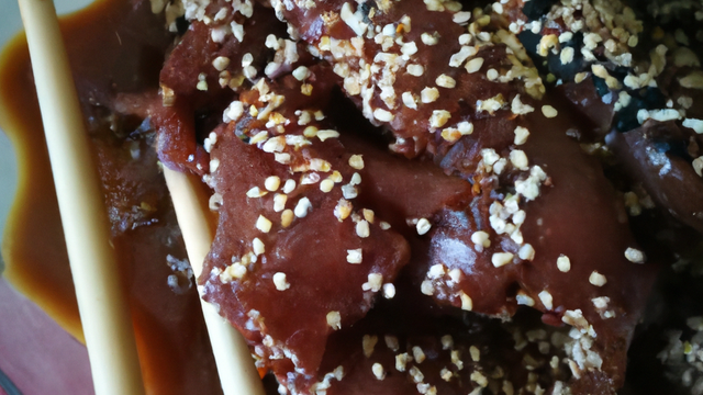 Des légumes, des lames de viande avec un supçon d'huile de sésame.