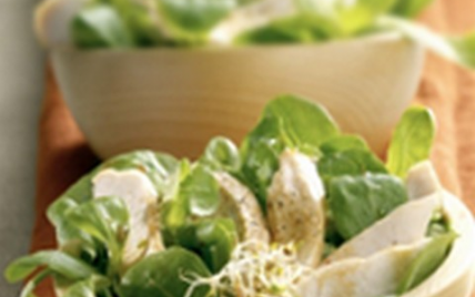 Dans une assiette, sur un lit de mâche que vous aurez préalablement assaisonnée avec l'huile d'olive et de sauce de soja, disposez les fines lamelles de lapin. Salez et poivrez. - 3