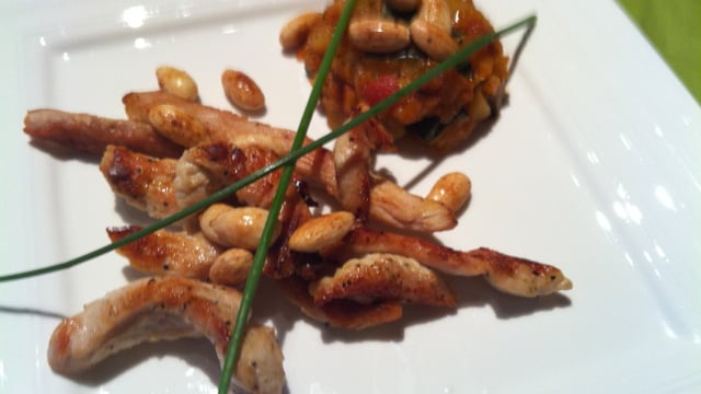 A l'issue des 30 min, faire revenir les lanières de dinde dans un filet d'huile d'olive avec quelques amande ou noisettes (facultatif) jusqu'à obtenir une coloration dorée.
