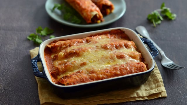 Et si on partait en voyage vers une destination ensoleillée : le Mexique ! Voici une recette d'enchiladas au bœuf 100% du fait maison qui vont ravir vos papilles. Ce sont des galettes de tortillas de blé ou de maïs garnies de viande hachée aux épices et d'une sauce pimentée. L'ensemble sera agrémenté de fromage râpé et les enchiladas seront gratinées au four. Un délice !