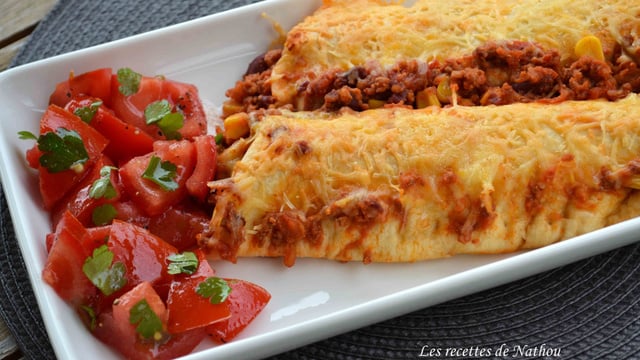 Répartissez le chili con carne au bas de chaque tortillas et roulez-les. Déposez-les dans un plat à gratin.