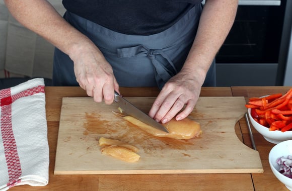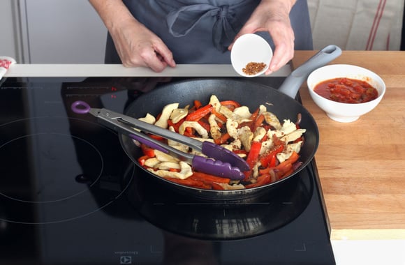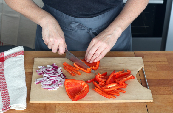 1Retirez les extrémités des poivrons, retirez graines et filaments blancs puis coupez la chair en lanières. Pelez et émincez l'oignon.
