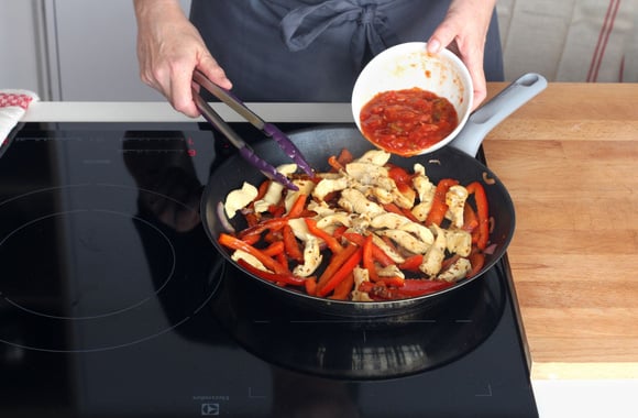 6Ajoutez les 3/4 de la salsa, mélangez, versez dans le bol avec le poulet et mélangez.