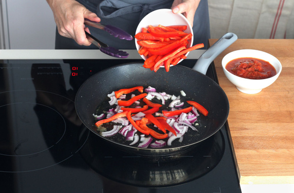 4Ajoutez les poivrons, l'oignon, 1 cuillère à soupe d'huile d'olive et faites revenir pendant 5 minutes.