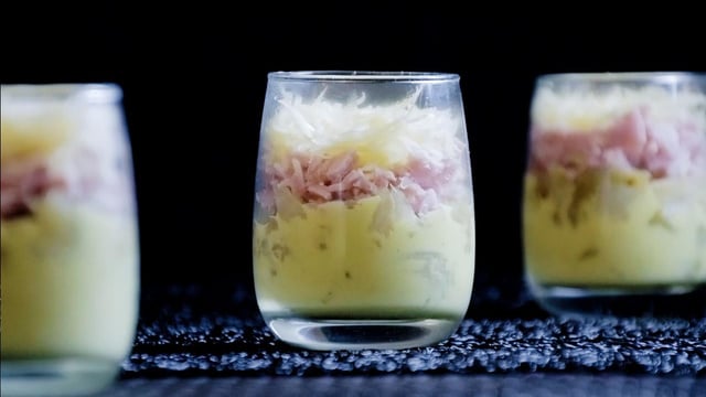 Prenez 4 verrines, déposez-y au fond la sauce béchamel au curry.