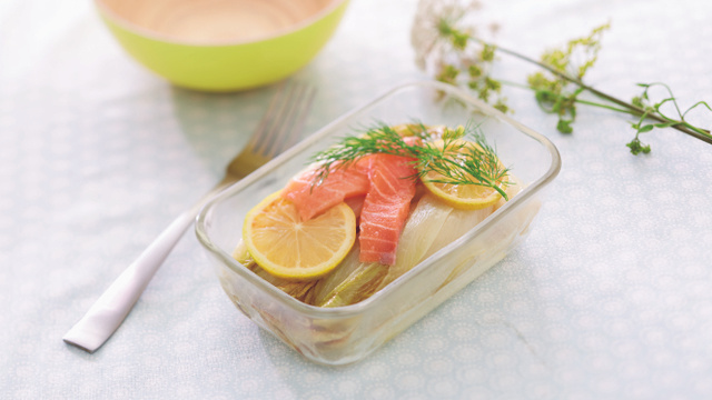 Coupez le citron en tranches et disposez-les sur les endives. Faites cuire à nouveau au micro-ondes, pendant 3 min, puis retournez-les. Arrosez-les à nouveau avec le beurre et remettez à cuire 3 min. Dressez vos endives dans une assiette, salez et poivrez, puis placez les tranches de saumon mariné sur celles-ci, et arrosez-les de jus de cuisson.