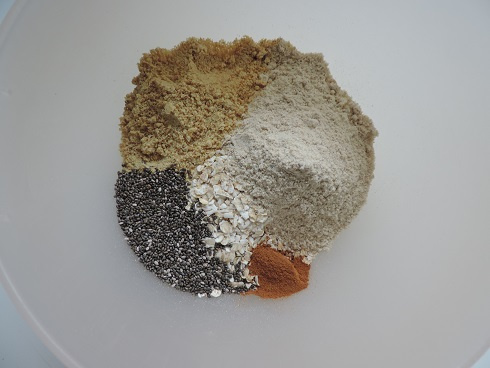 1Dans un saladier, mélanger les flocons d'avoine avec la farine de graines germées, la linette, les graines de chia et la cannelle.