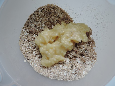 3Ajouter la banane écrasée et mélanger le tout. Former un boudin, envelopper d'un film alimentaire et laisser durcir au frigo au moins 1h.