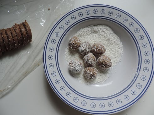 4Ensuite, enlever le film, couper en tranches égales, former des boules et les passer dans la noix de coco râpée. Placer au frais jusqu'au moment de la dégustation.