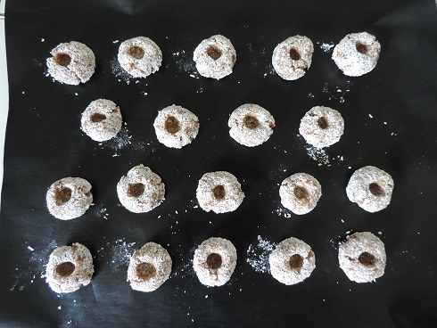 5Il est également possible de poursuivre la recette. Sur un papier sulfurisé, placer les boules, les enfoncer légèrement en plaçant le bout d'une cuillère en bois au centre, afin de faire une cavité. Enfourner dans un four préchauffé à 180° quelques minutes. Laisser refroidir sur une grille et placer un peu de délicieuse caraméline quetsche au centre.