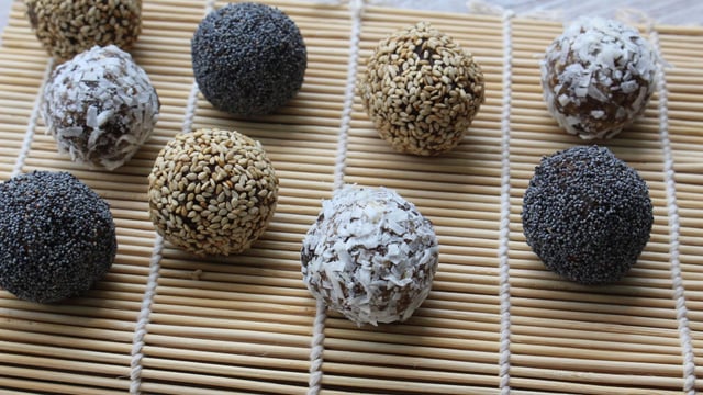 Prélever 15g de l'appareil pour former des petites boules puis rouler les dans la coco râpée, les graines de pavot ou les graines de sésame.