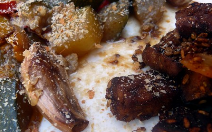 Il n'y a plus qu'à disposer ce concentré de saveurs dans votre plat à tajine (ou dans une cocotte en terre cuite/grès, supportant la cuisson au four). Versez avec amour un beau filet d'huile d'olive, la sauce soya et le vinaigre balsamique, puis finissez en parsemant de quelques pignons grillés.